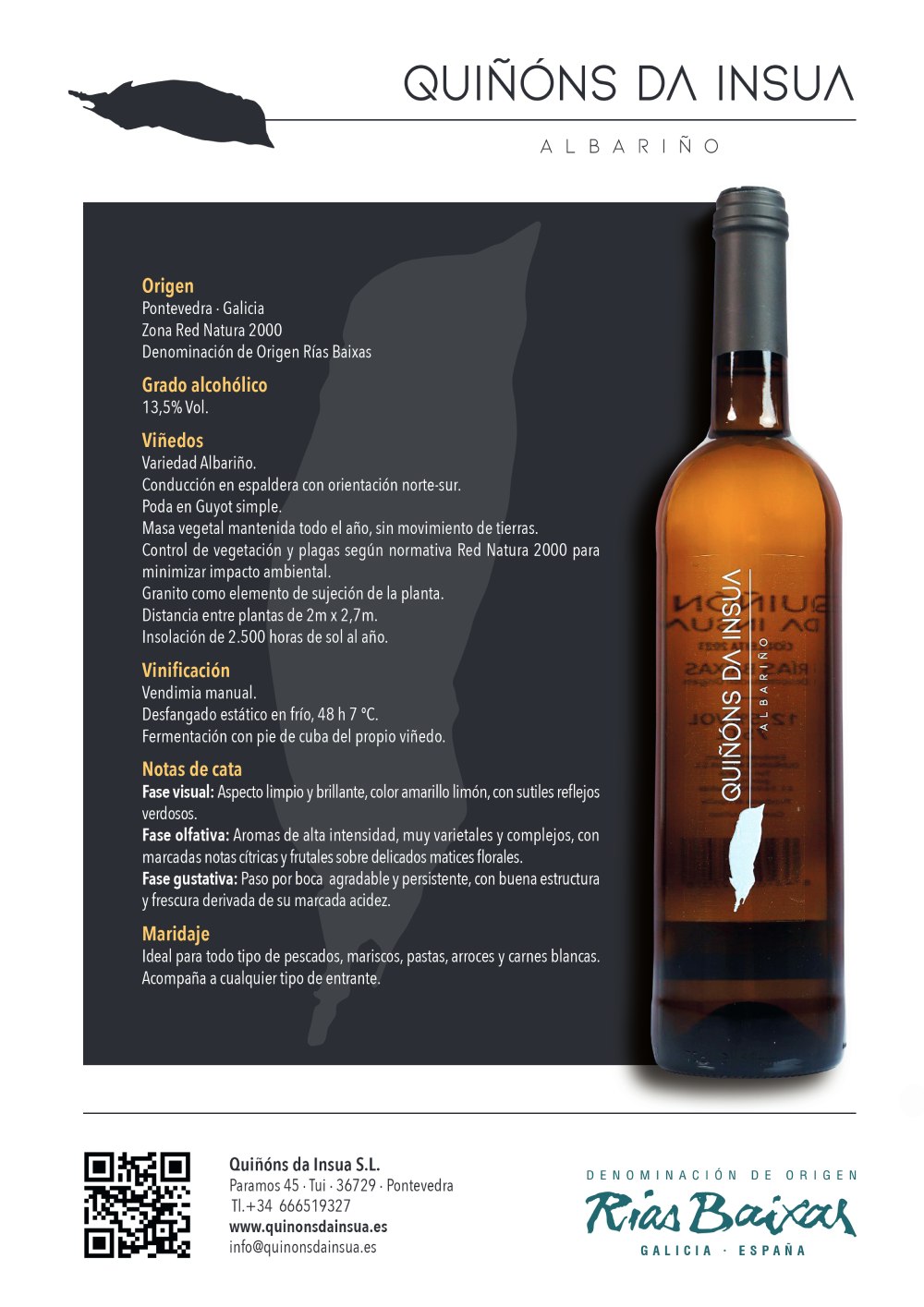 Quiñóns da Insua Albariño nace en Pontevedra, Galicia, dentro de la Denominación de Origen Rías Baixas, en un entorno natural de gran valor integrado en la Red Natura 2000. Es un vino que refleja el carácter del viñedo, el respeto por la tierra y una elaboración cuidada desde el origen.